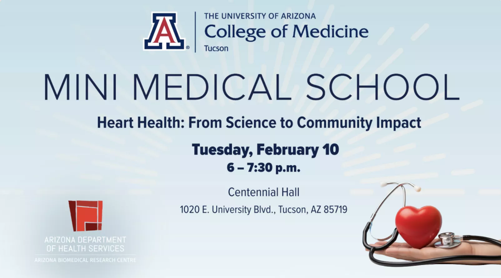 Public Event: Heart Health: From Science to Community Impact. Join AWCIM Director Stephen Dahmer, MD, and others at UA Centennial Hall.